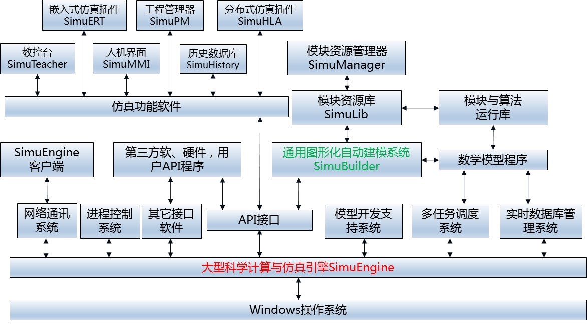 SimuWorks運行于Windows平臺,其中SimuEngine是最核心的部分,其他軟件都是在它的支撐下運行。SimuWorks的體系結構如下圖所示: