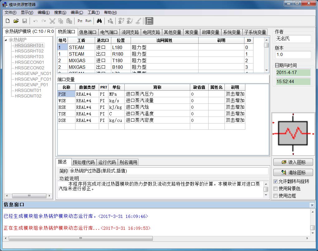 窗口的上部為主菜單和工具欄,下部為信息窗口和狀態顯示區,中間部分從左至右依次為:左側為當前打開的模塊組,以及所包含的模塊類和模塊;中間為模塊端口、支路、變量、運行代碼和預處理代碼定義,以及模塊描述;右側為作者、版本和事件信息,以及圖標和顯示方式等。