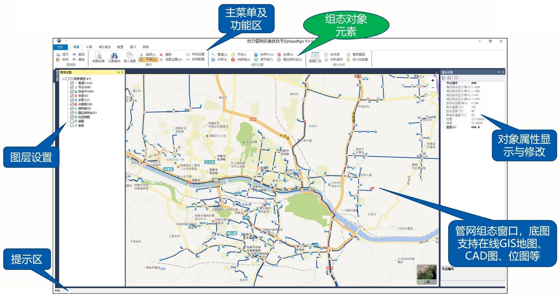 SimuPipe采用GIS地圖和圖形化組態(tài)方法,主窗口及各功能區(qū)的說明如下圖所示: