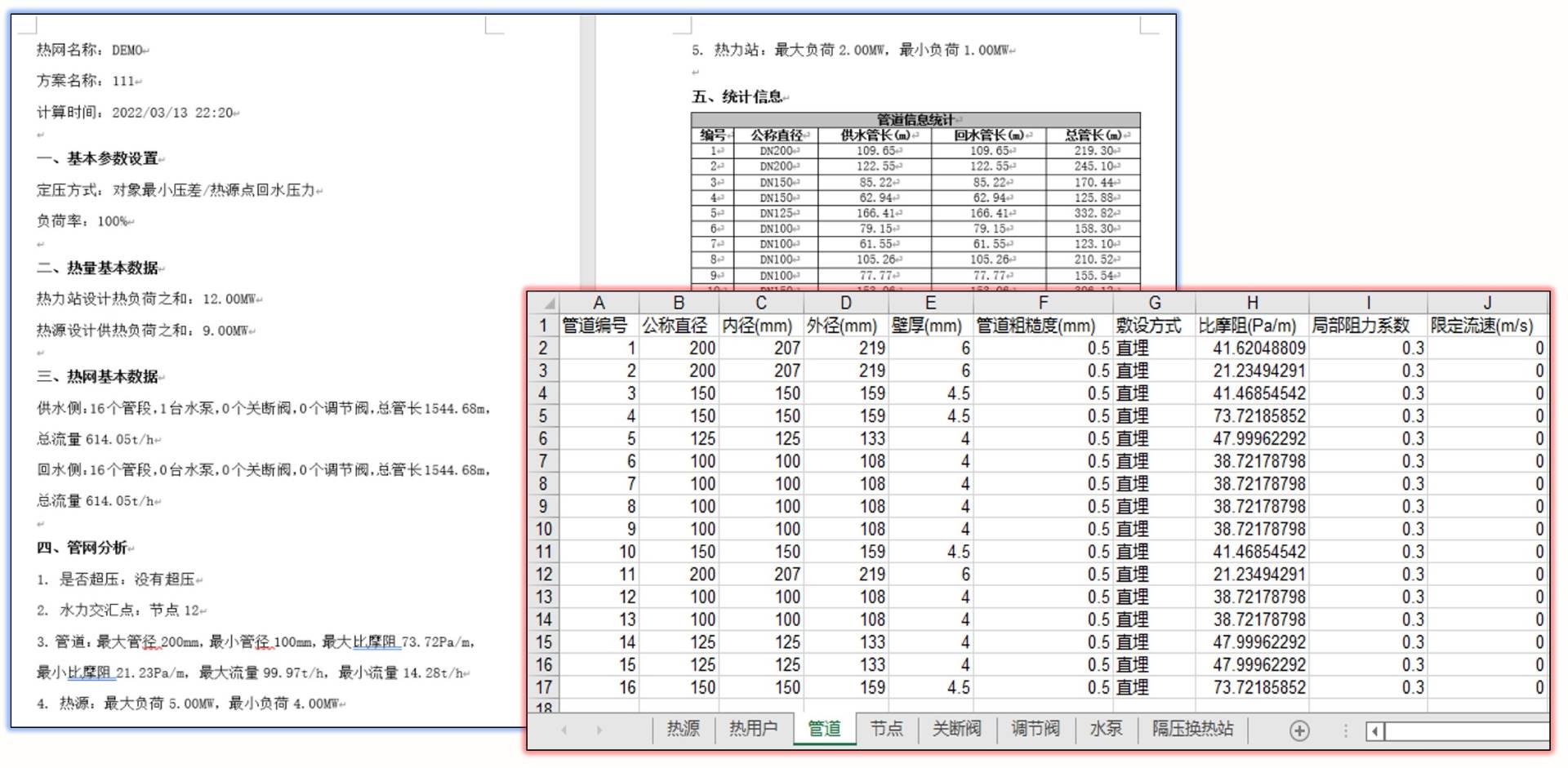 SimuPipe可以將熱網(wǎng)數(shù)據(jù)以報告的方式輸出(Word和Excel文檔格式),如下圖所示: