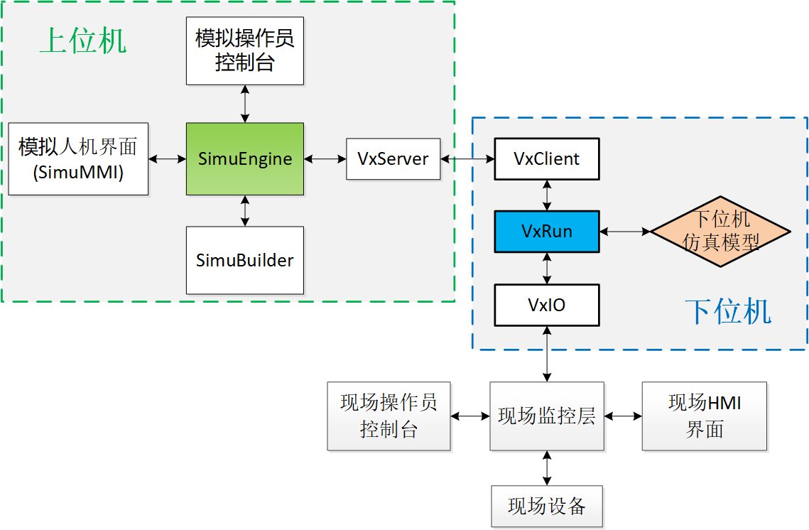 1.SimuEngine將在離線組態調試系統中完成的下位機仿真模型,通過VxServer與VxClient的通訊,下載至下位機并將其控制權交付給VxRun。